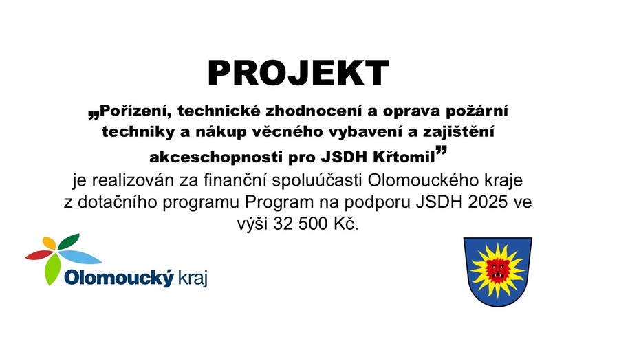 Úvod > Přijaté dotace > Dotace 2025 > Pořízení, technické zhodnocení a oprava požární techniky a nákup věcného vybavení a zajištění akceschopnosti pro JSDH Křtomil